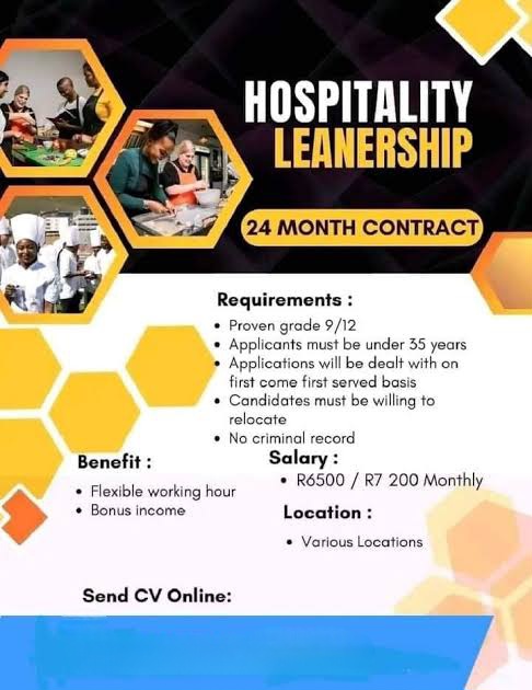 Hospitality Learnerships: Apply Now! We are offering various learnerships in the hospitality industry, including Food & Beverage, Hospitality Reception, and Professional Cookery. These learnerships are available in different locations, including Nelspruit, Port Elizabeth, East London, Kimberly, and Bloemfontein. The learnerships