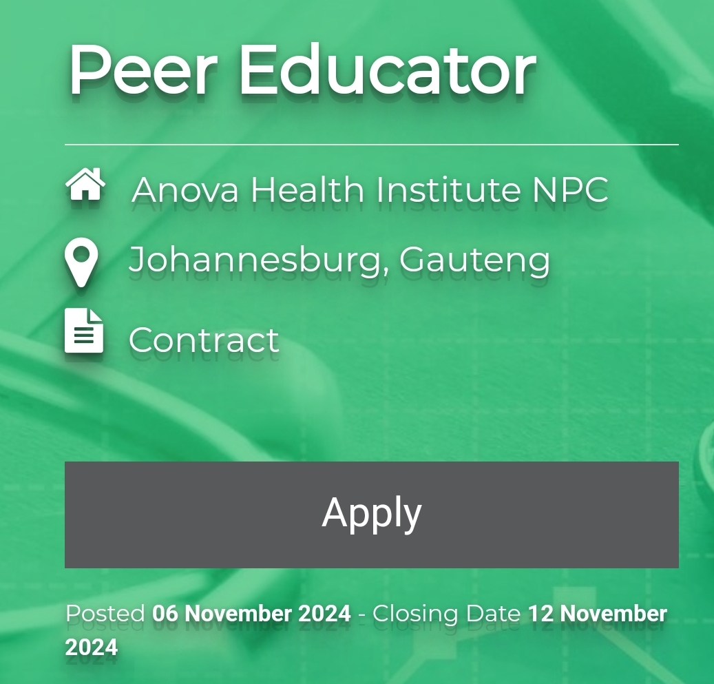 The Role of Peer Educator at Anova Health Institute Anova Health Institute, a renowned non-profit organization in Johannesburg, Gauteng, has recently posted a vacancy for a Peer Educator. This role offers a unique opportunity for individuals passionate about public health